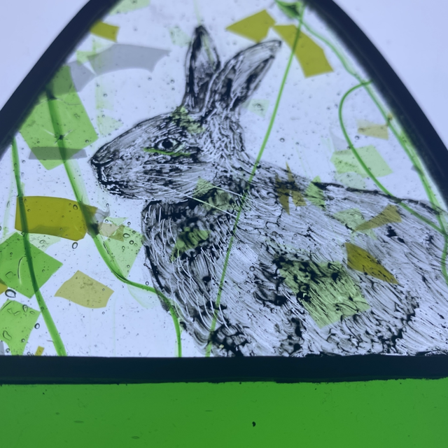 Hare hand painted onto the glass using traditional stained glass painting. Paint fired permanently onto the glass. Hare painted on ‘confetti’ glass’ which has a slight rough texture on the back. Glass pieces lead and tied with ribbon.