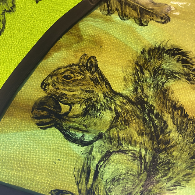 Squirrel and oak leaves and acorns hand painted using traditional stained glass painting. Paintings are fired permanent on the glass. Glass lead together, cemented and hung with ribbon.